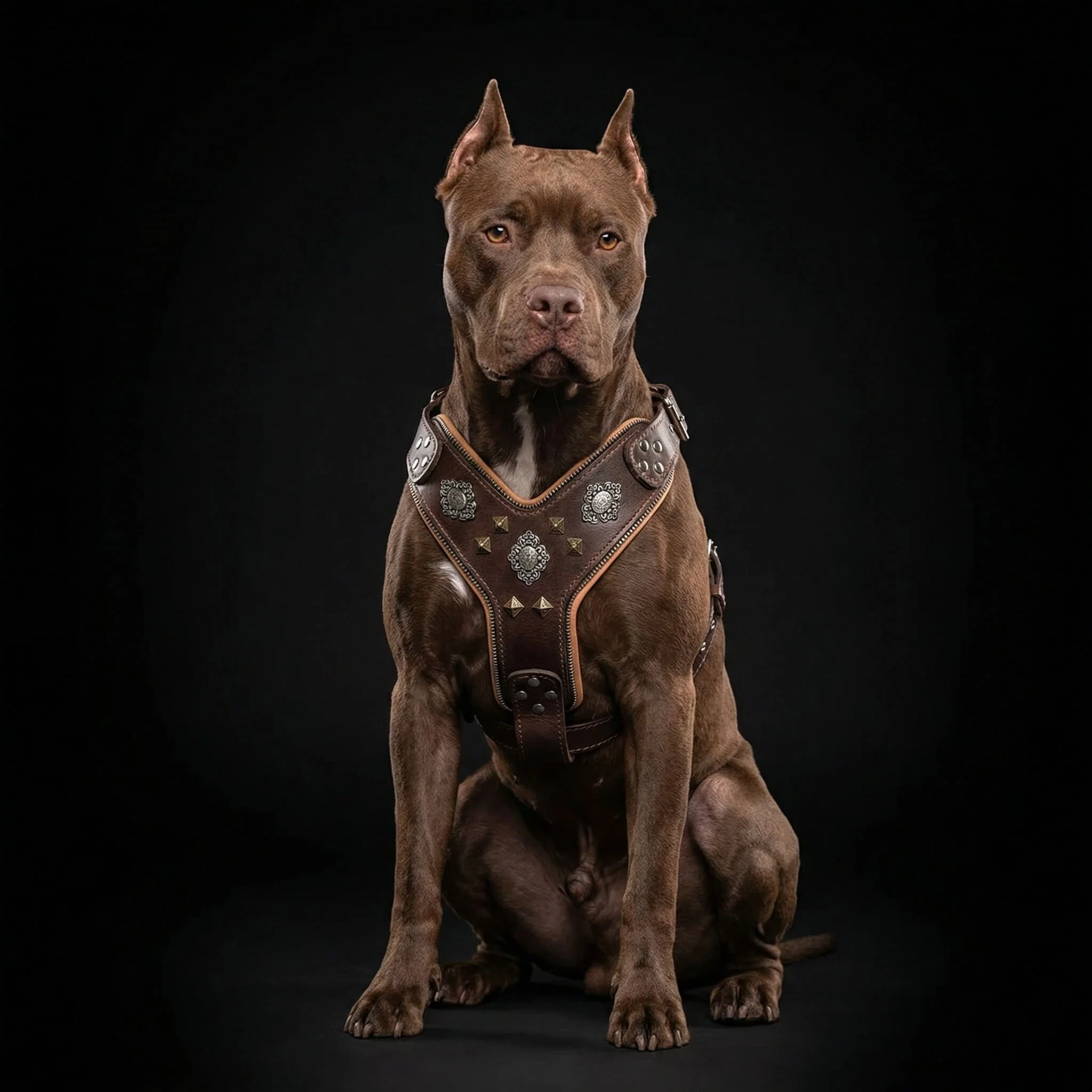 It features an intricate mix of two rivet styles in dual plating colors — antique brass and old silver — enhanced by a unique zipper decoration that gives the harness an unmistakable look.