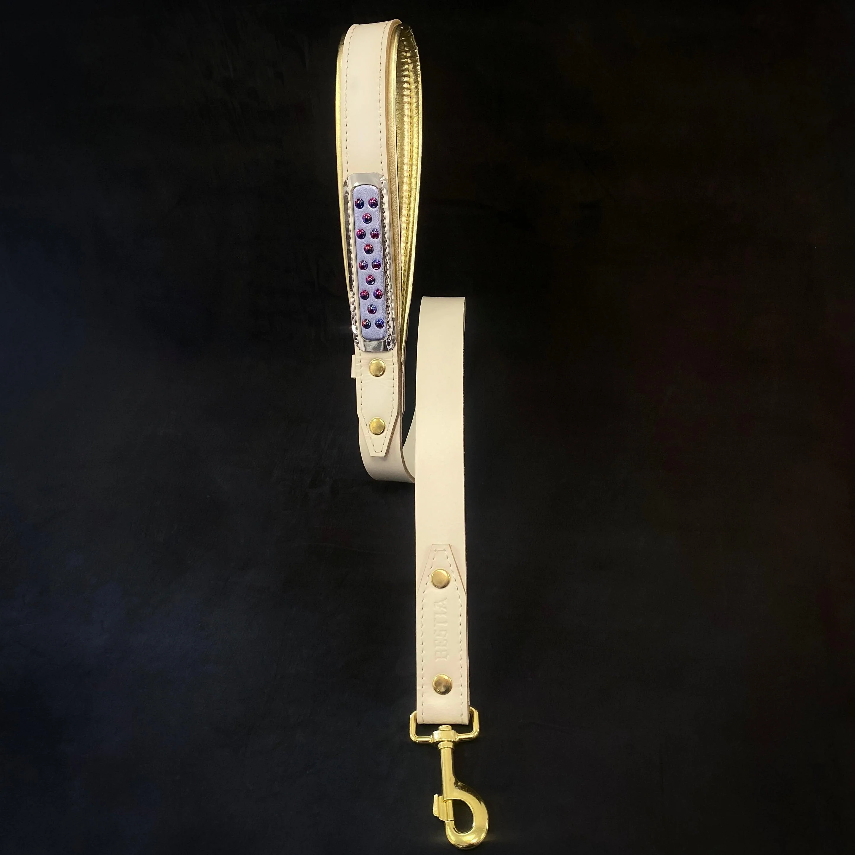 The 2.5-inch wide “Candy” Collar blends vibrant, playful accents with luxurious materials and precise European craftsmanship. Built on a premium white genuine leather base and finished with brass-plated (gold) hardware, it adds a lively, high-end touch to your dog’s look while delivering real-world comfort and control.